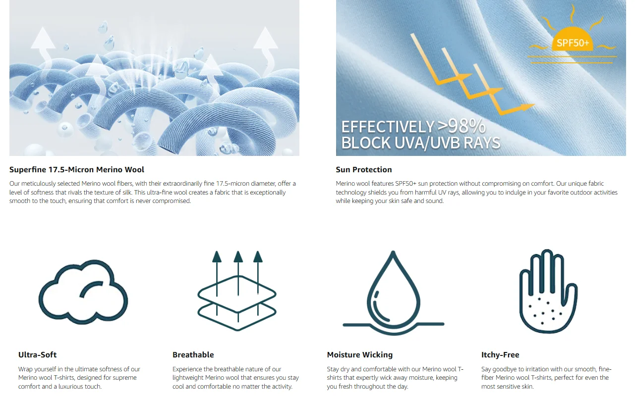 2.Super Soft & Comfortable: 100% Superfine 17.5 Micron Merino Wool Tshirts provide all day comfort and no itch! Merino wool shirt designed for daily wear without rubbing and overheating of regular cotton.