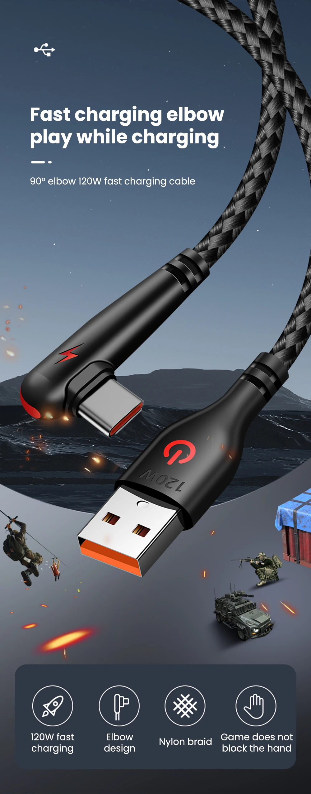 120W USB To Type-C Cable 90 Degree Elbow Mobile Phone Fast Charging For Huawei Mate 40 30 Xiaomi Samsung Phone Charging Cord