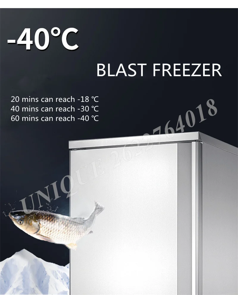 Fast food, especially fresh fish and meat, can be refrigerated below -40℃ for about 60 minutes.It is mainly used for fast and cold freezing of food, mousse, cake and frozen dumplings, glutinous rice balls, steamed buns, etc. Ensure that the not losing nutrition, keep the fresh taste and good quick plastic effect.