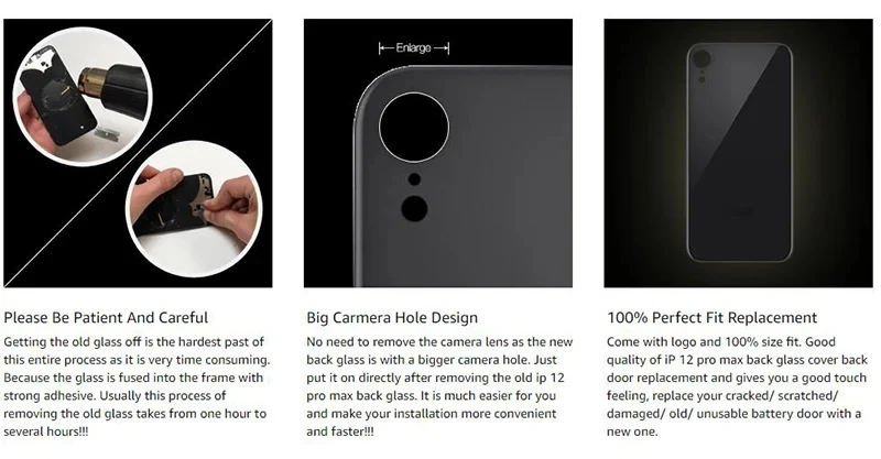 Report AbuseBig Hole Back Glass Cover For iPhone 12 Replacement Parts With Free Gifts,Tweezers+Engraving Knife+Alcohol Pads+Back Glue+Tools
