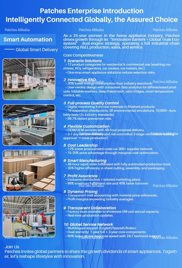 “innovative technology bariers + global integrity ecosystem” to build a full-chain closed-loop covering R&D – production -sales-service. Our products cover 12 major categories such as washing machines, air conditioners, refrigerators, car refrigerators, ice makers, freezers, and cold fans for both household and commercial use. Our headquarters is located in Zhejiang,with eightintelligent bases covering over 1,000 professionals. Relying on 100+ patented technologies and 8 international certifications such as CE/ETL,we provide solutions for both household and commercial scenarios to over 120 countries around the world.