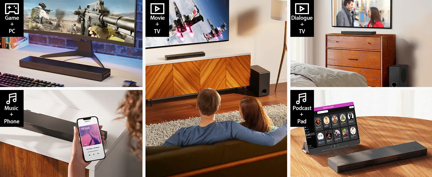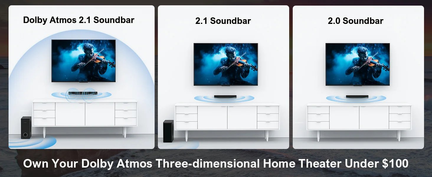 4. Premium Dolby Atmos Decoding: Compatible with Blu-ray, streaming services on TVs (Netflix, Prime Video) and set-top boxes. The Nova S50 supports full decoding and playback of Dolby Atmos content and is backwards compatible with Dolby Digital and other Dolby audio formats. With Dolby Atmos being the future of audio technology, you can enjoy the auditory feast of Dolby Atmos for the price of a 2.1-channel Dolby Digital soundbar.