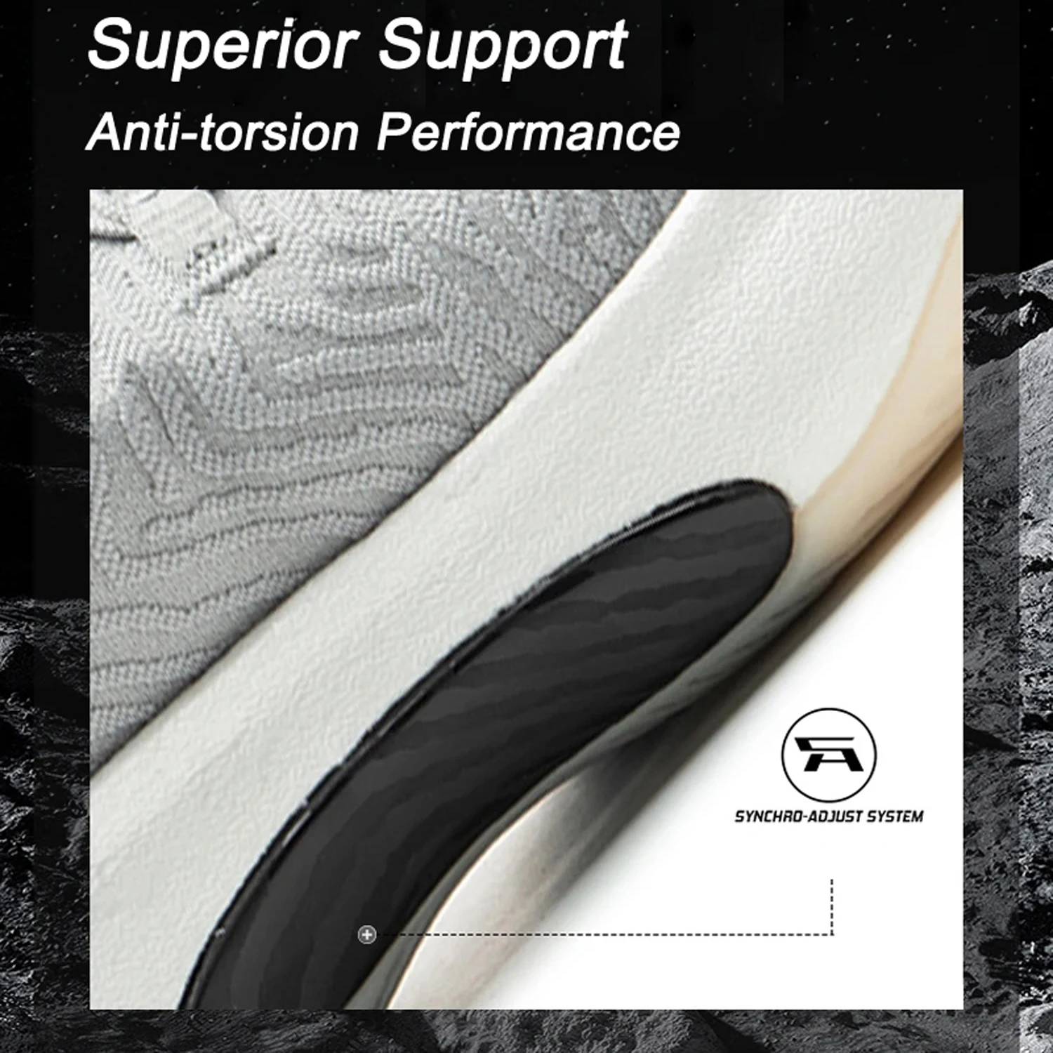 SYNCHRO-ADJUST SYSTEM: The composite 3D TPU support system, combined with vibration-absorbing and rebound materials, meets various functions such as heel stability control, midfoot force transmission and support, forefoot lateral support and stability, and integrates the entire shoe into a synchronized sports system. (Exclusive to SAS Yushuai)