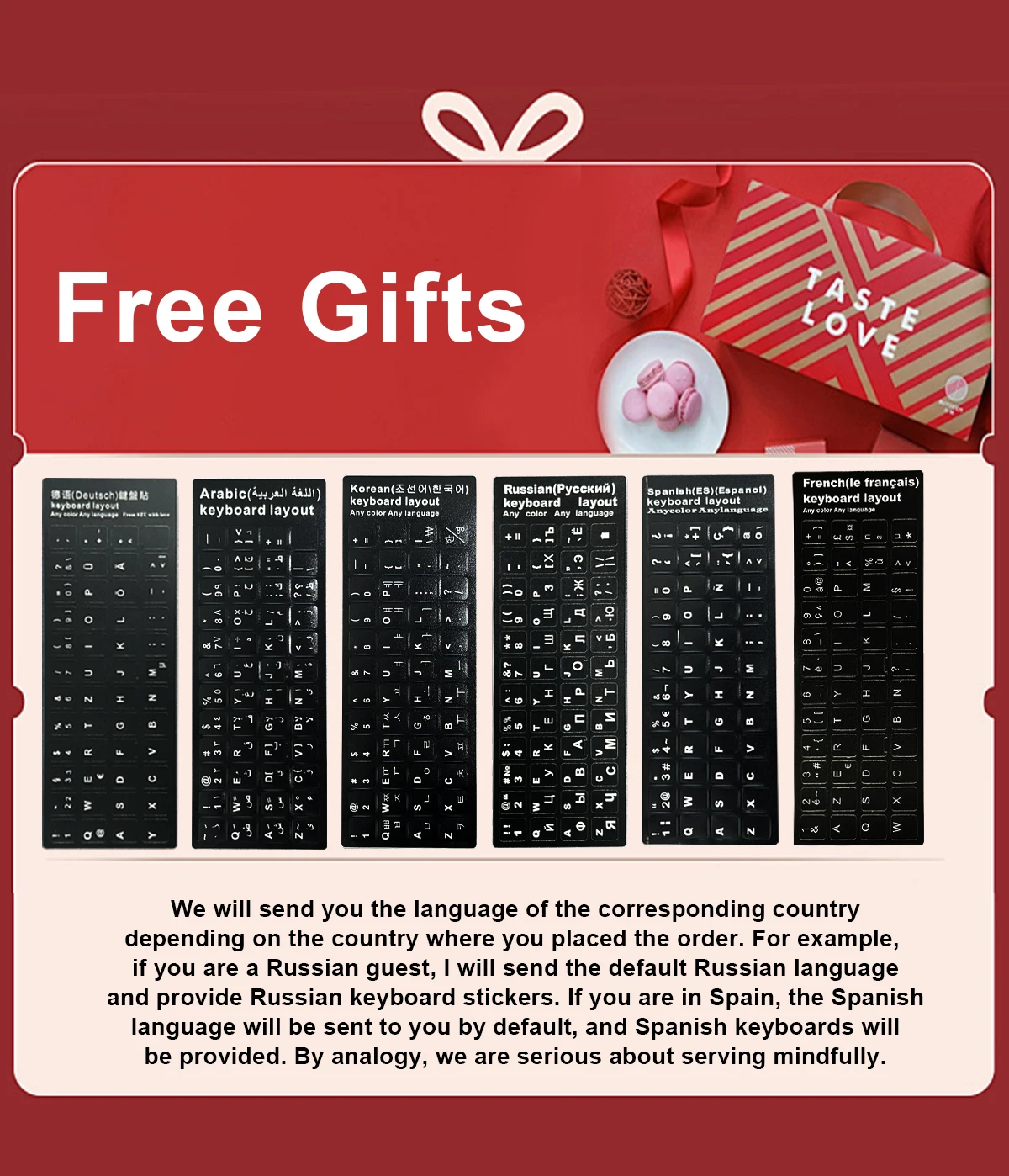— Our keyboard is QWERTY English standard version, but we will send keyboard stickers of other languages below as a gift. If you need it, just leave us a message. Keyboard stickers: Russian, Spanish, French, German, Italian, , Arabic, Turkish, Thai, Japanese, Korean.