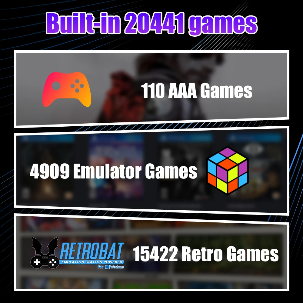 This 2TB Gaming SSD is 3 syastem in 1, built-in 20441 Games, including 110 AAA games (Playnite Gaming System), 4909 emulator games (Launchbox Gaming System) and 15422 retro games (Retrobat Gaming System), more games for you to choose from