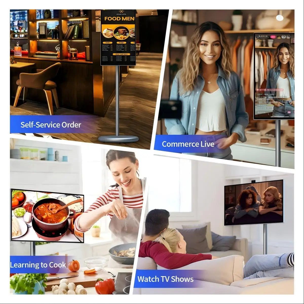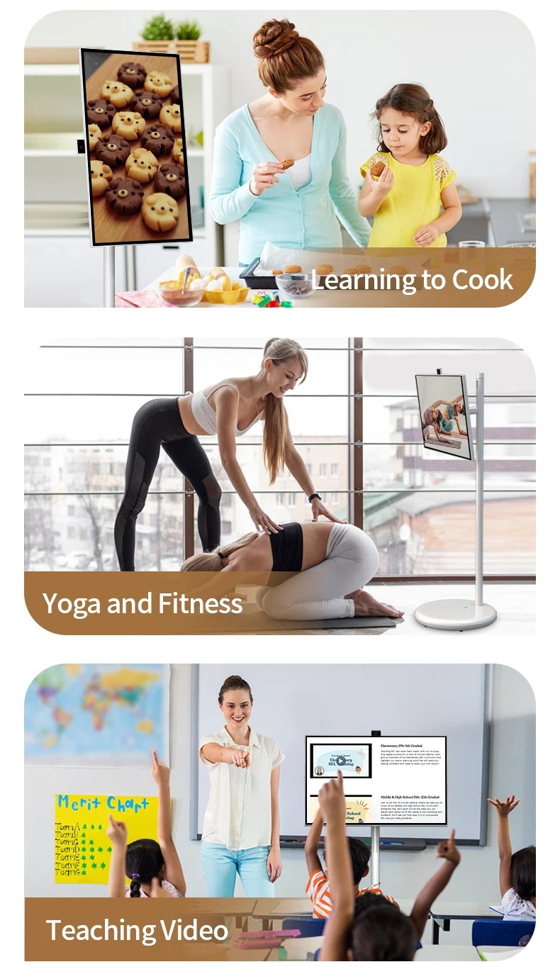 it the perfect all-in-one display for home, kitchen, office, or classroom. With its rotatable, height adjustable stand and universal wheels, you can easily move it between rooms for live streaming, cooking tutorials, or remote learning.