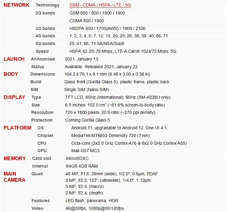Samsung Galaxy A32 5G specifications