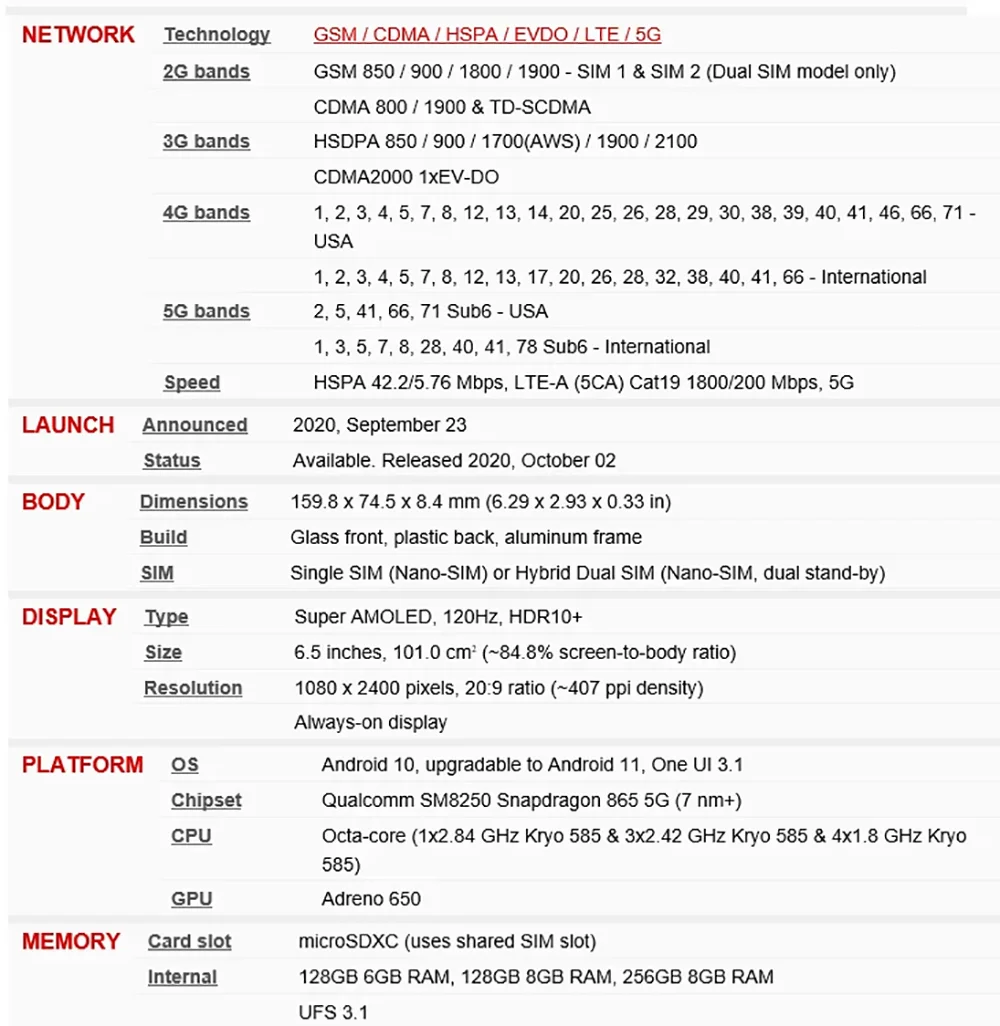 Samsung Galaxy S20FE 5G specifications