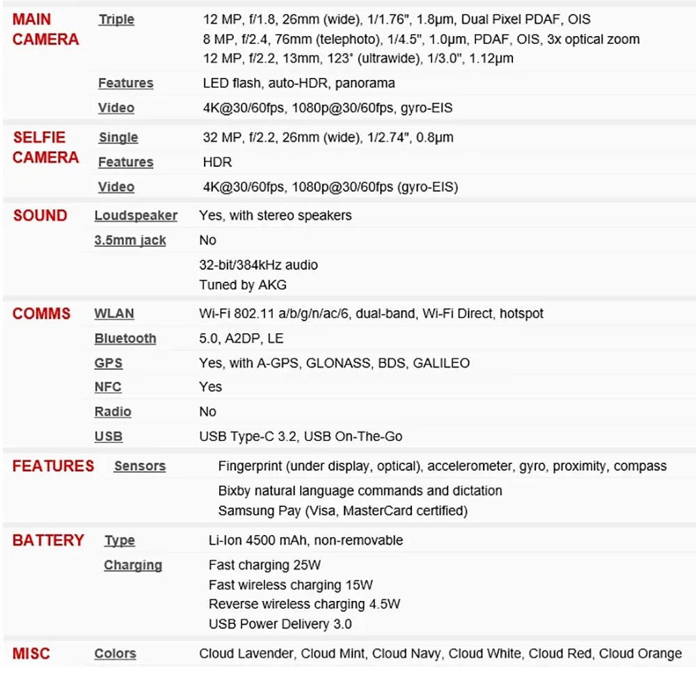 The network and connection support 5G (Sub-6GHz, Verizon has millimeter wave specification version) Wi-Fi 6、 Bluetooth 5.0 NFC