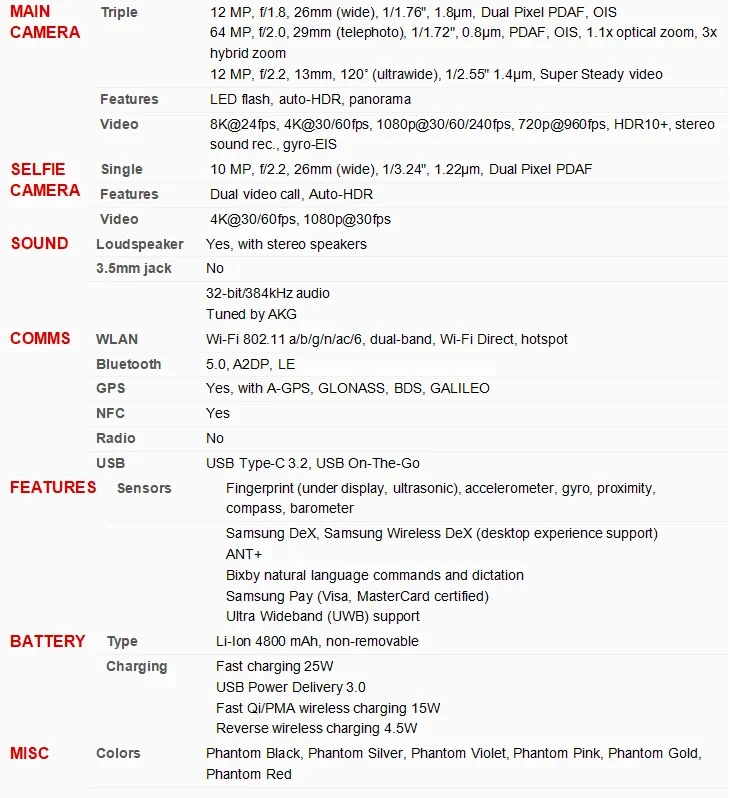 The network and connection support 5G (Sub6 and mmWave), with some versions featuring a single SIM card, while others support dual SIM and dual standby