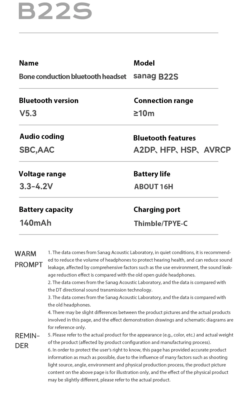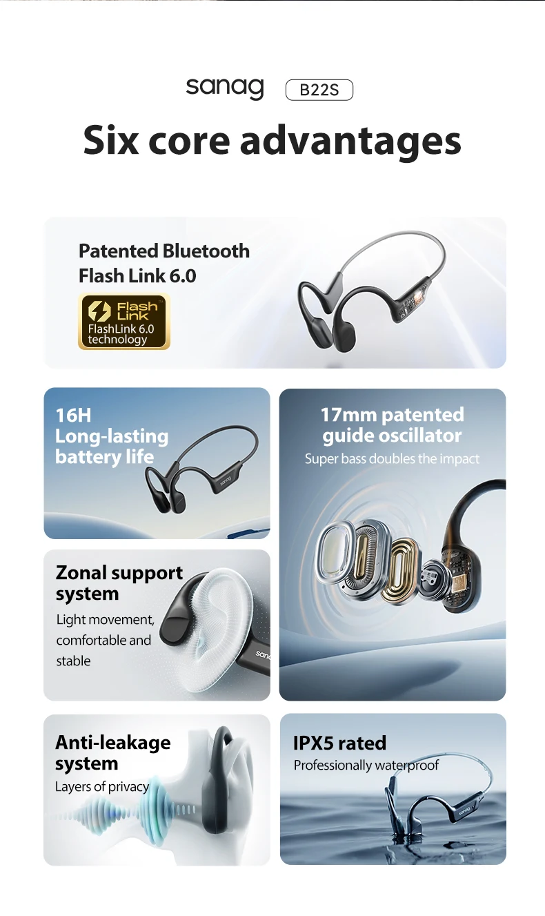 • Bone Conduction Technology :The Sanag B22s earphone features bone conduction technology, providing a unique listening experience that enhances your music appreciation.