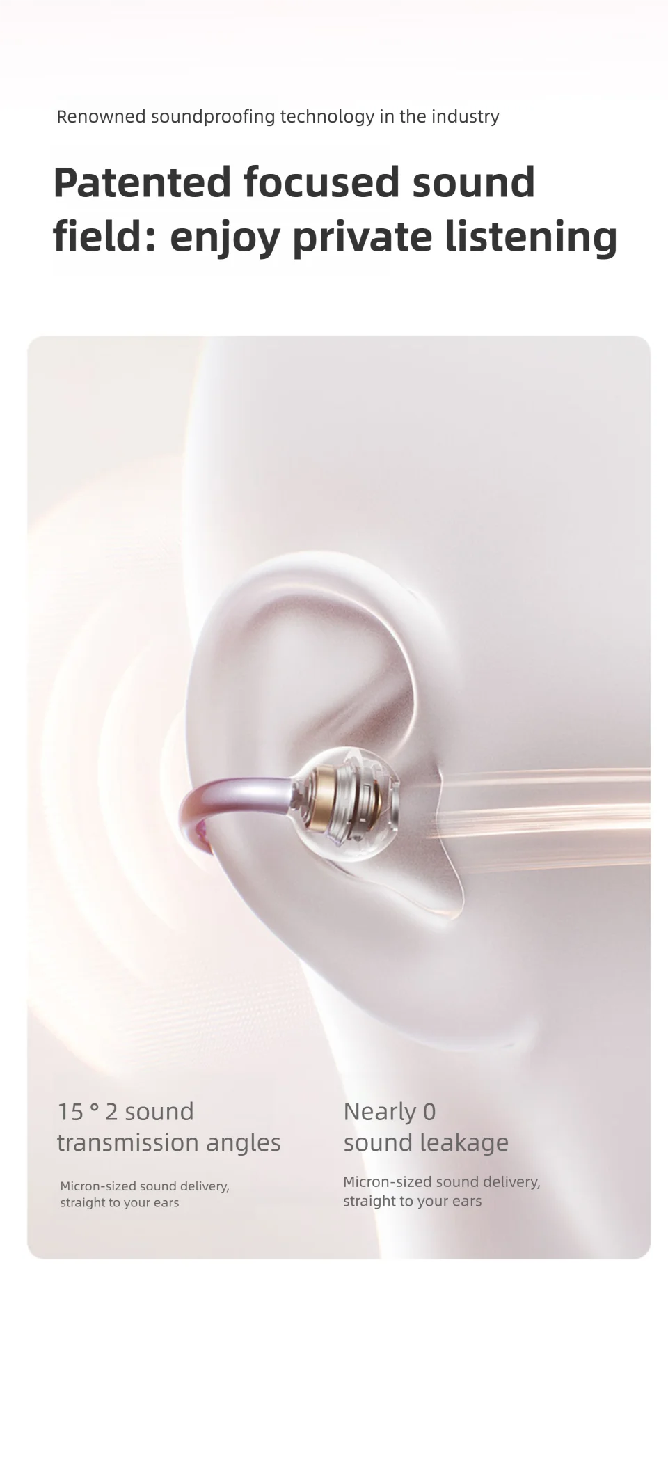 15° transmission angle with micron-level precision directs sound directly into the ear, achieving near-zero leakage for enhanced privacy.