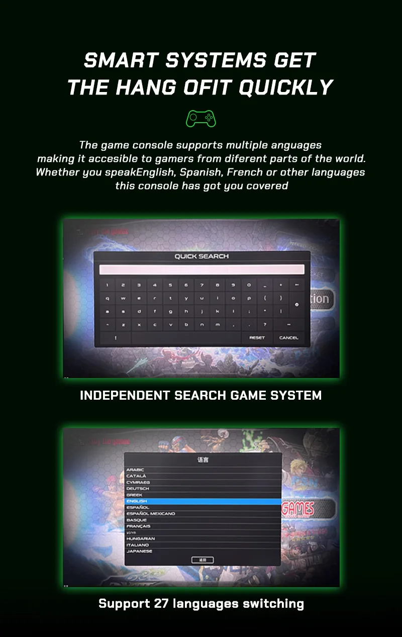 Finding your favorite game is a breeze with the quick search function, letting you jump into gameplay in no time. Additionally, the G36 PRO supports 27 languages, allowing users from around the world to navigate easily. Its portable design and user-friendly interface make it convenient to start gaming anytime, anywhere, with just a few simple steps.