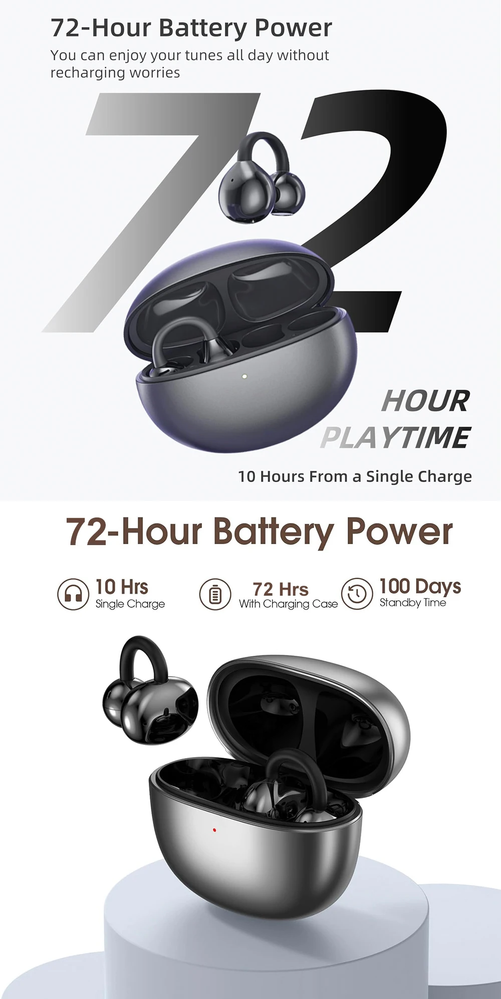 10 hours per charge, 72 hours with sleek case—rapid 1-hour recharge keeps you powered from dawn to midnight. Outlasts rivals for uninterrupted playlists, podcasts, or binge sessions without battery anxiety.