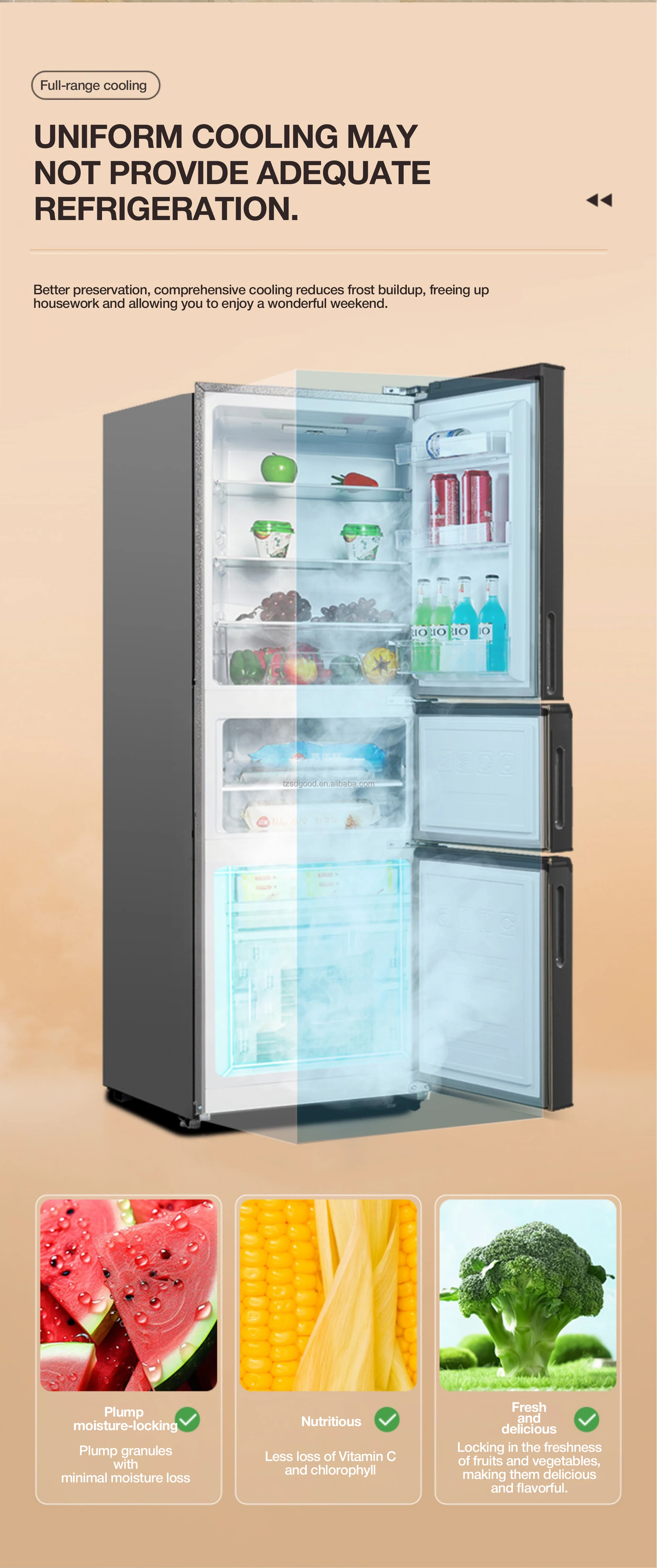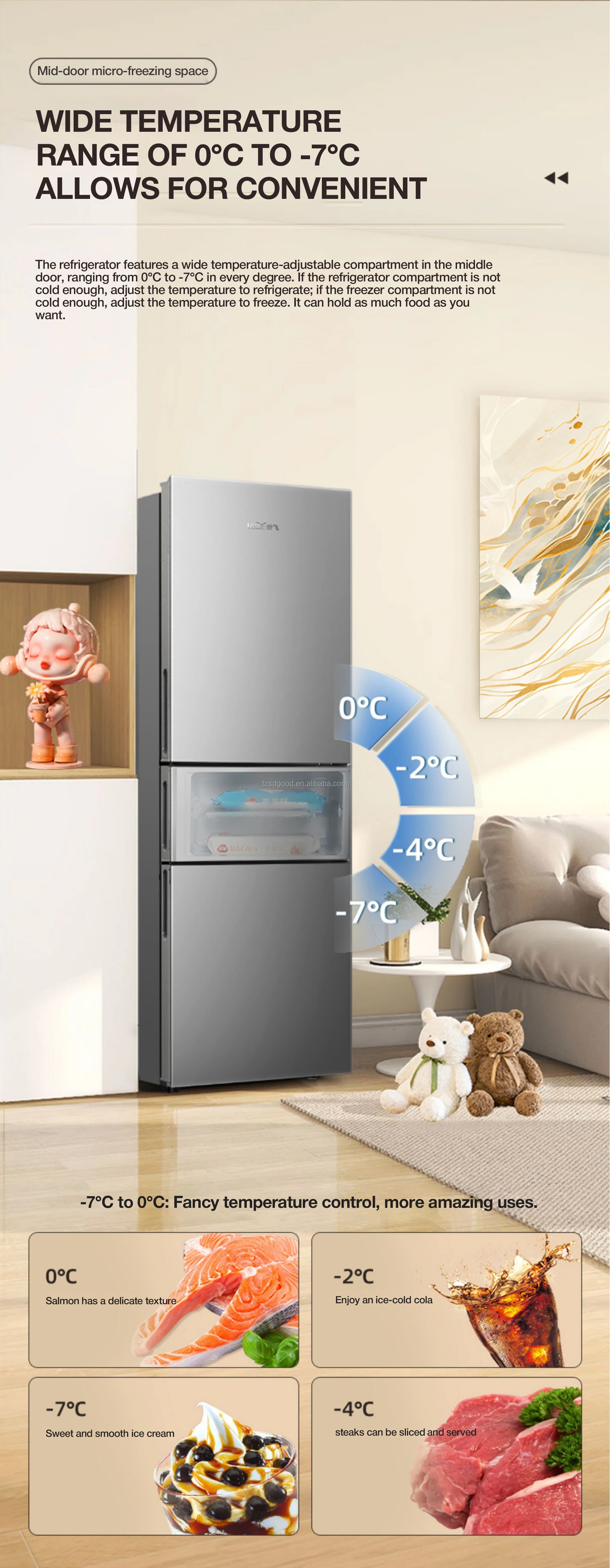 3-Door & 3-Temperature Zones, Middle Door Soft Freezing (2-8℃), Refrigeration (-23–18℃), Cold Retention & Freshness Preservation