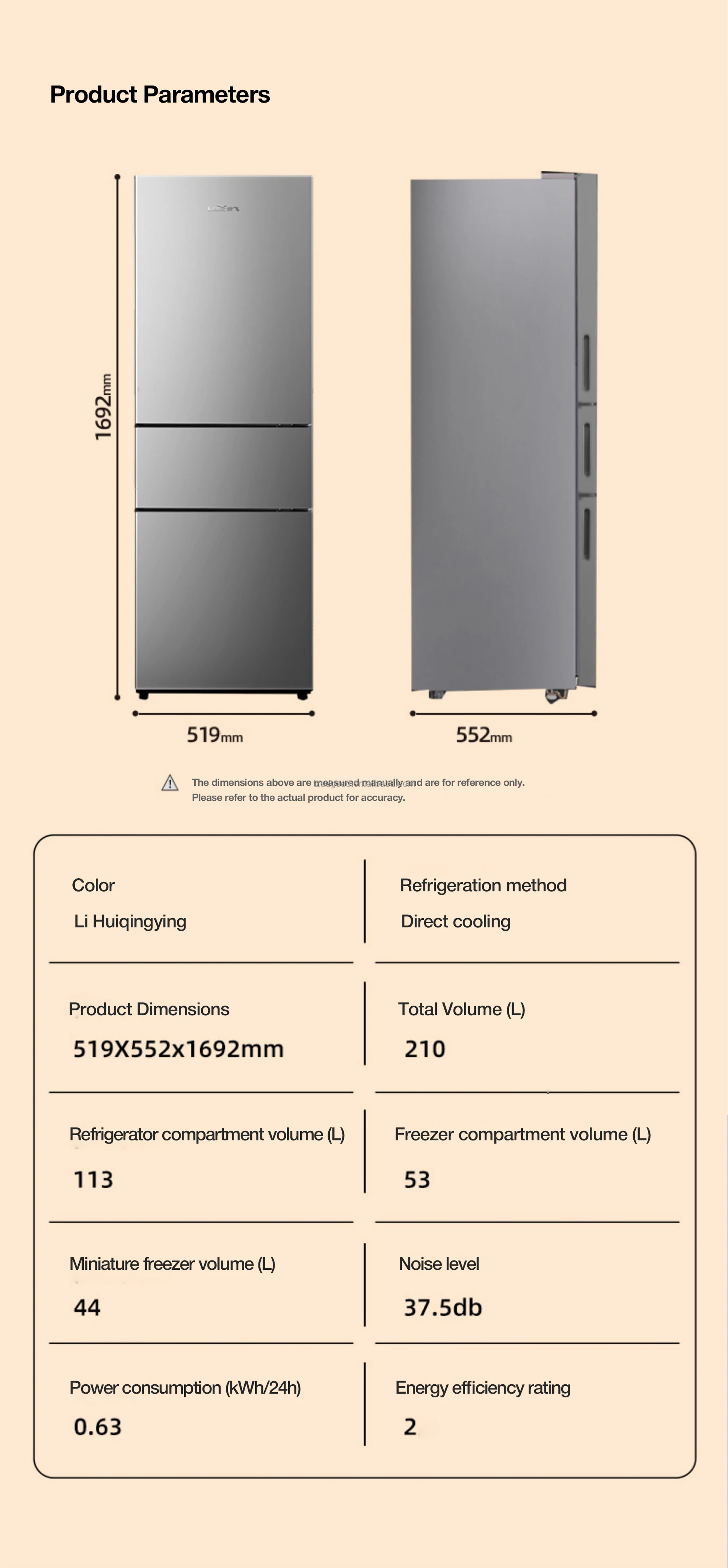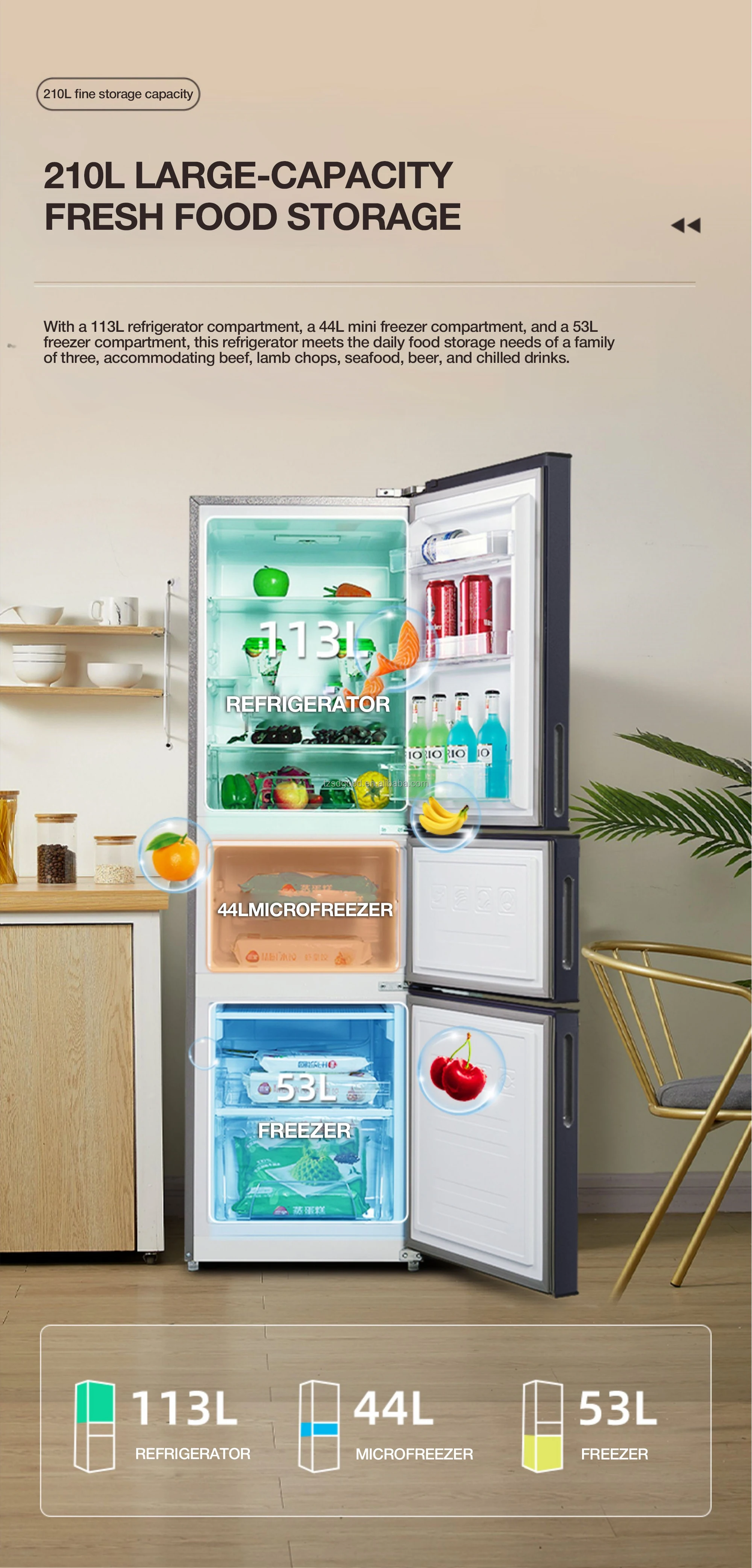 Total Capacity: 210L, Refrigerating Chamber: 113L, Freezing Chamber: 53L, Middle Door Soft Freezing Chamber: 44L